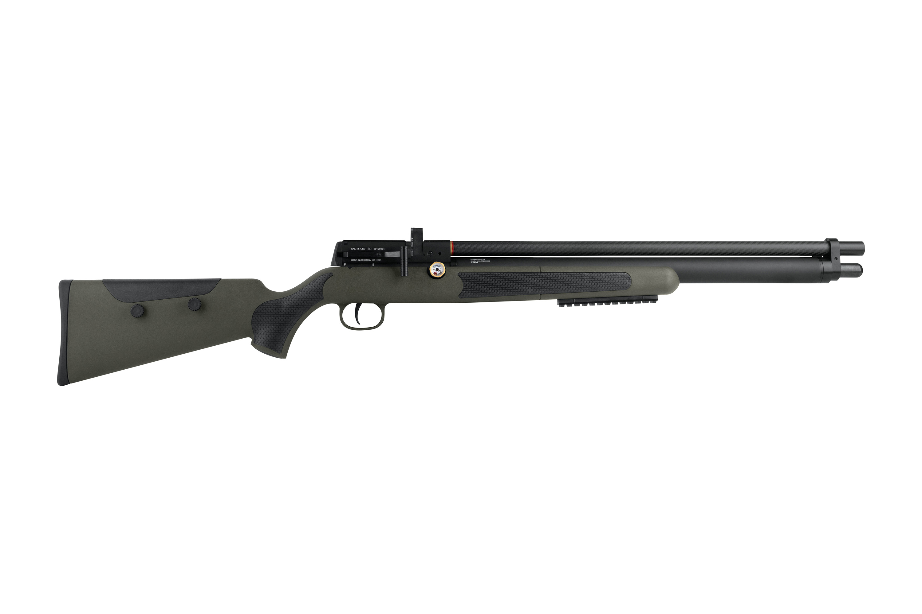 Der 280 ml Tank, befüllbar mit 200 bar, ermöglicht bis zu beeindruckende 360 Schuss pro Füllung. Der hochwertige ALTAROS Regulator sorgt für eine konstant hohe Schussleistung, während der integrierte Kompensator im Carbon-Laufmantel die Geräuschentwicklung minimiert. Das rotierbare Manometer ermöglicht eine direkte Druckkontrolle während des Schießens, ohne den Blick vom Ziel zu nehmen. Ein zweites Manometer für den Regulatordruck befindet sich bequem erreichbar an der rechten Seite des Gewehrs.