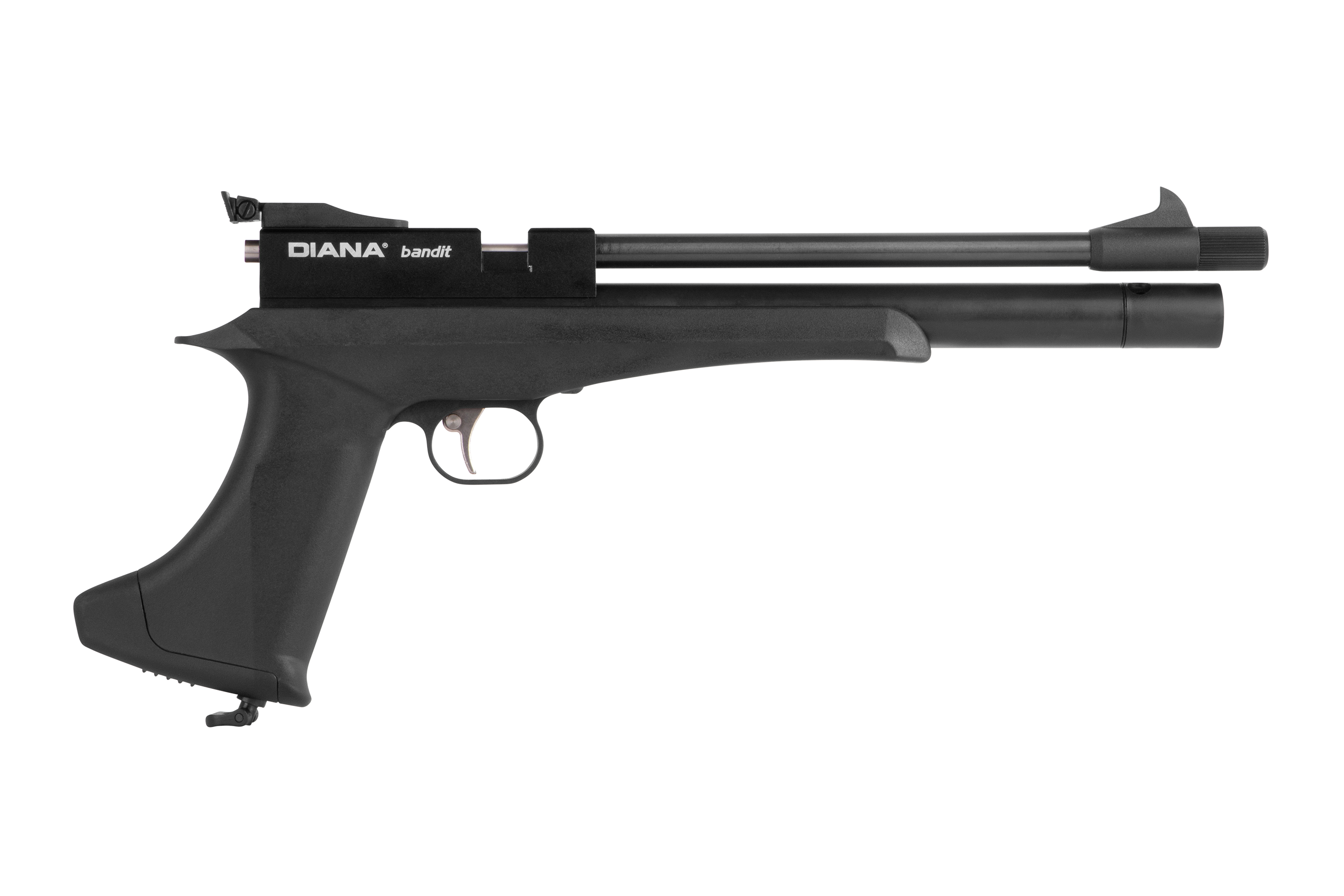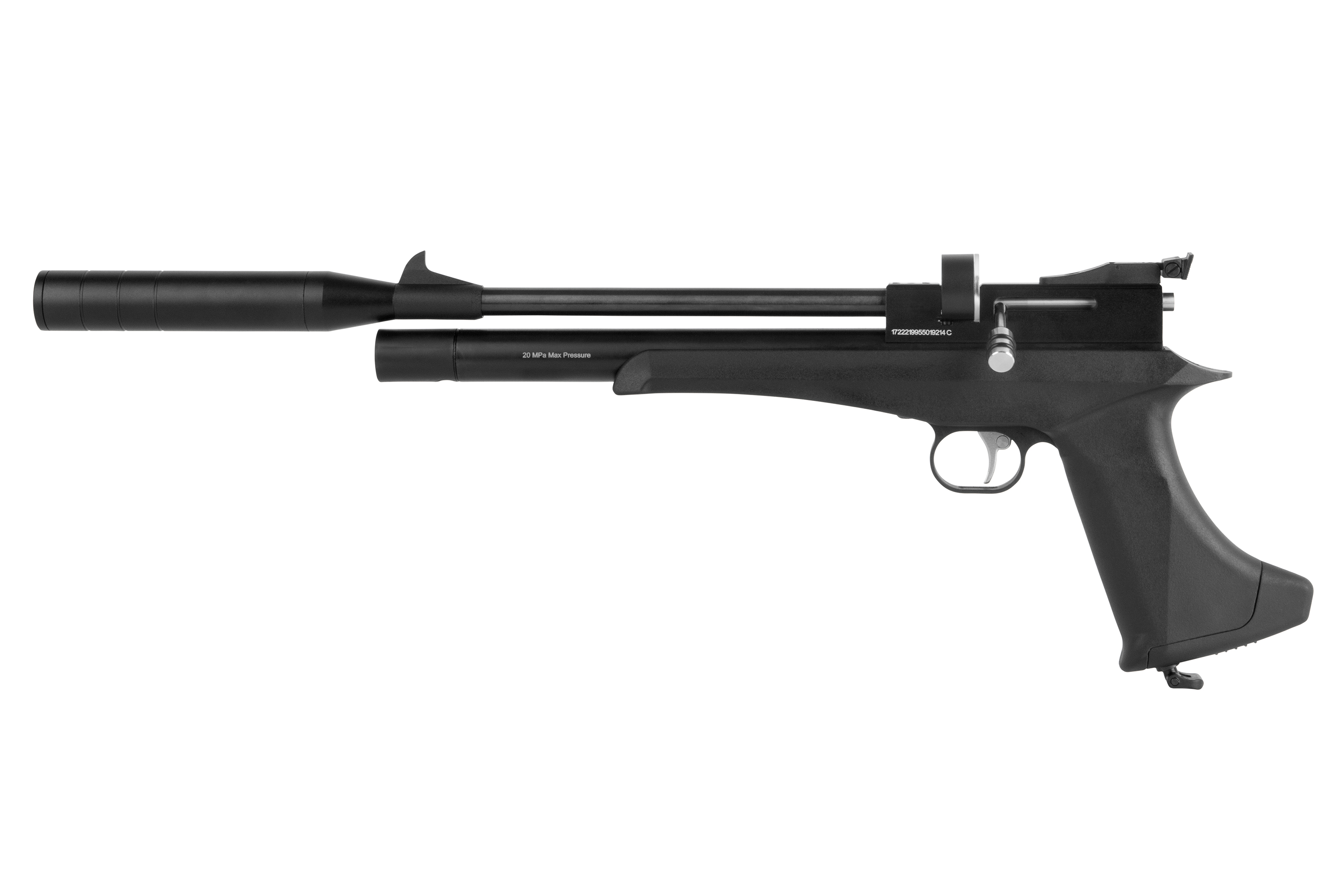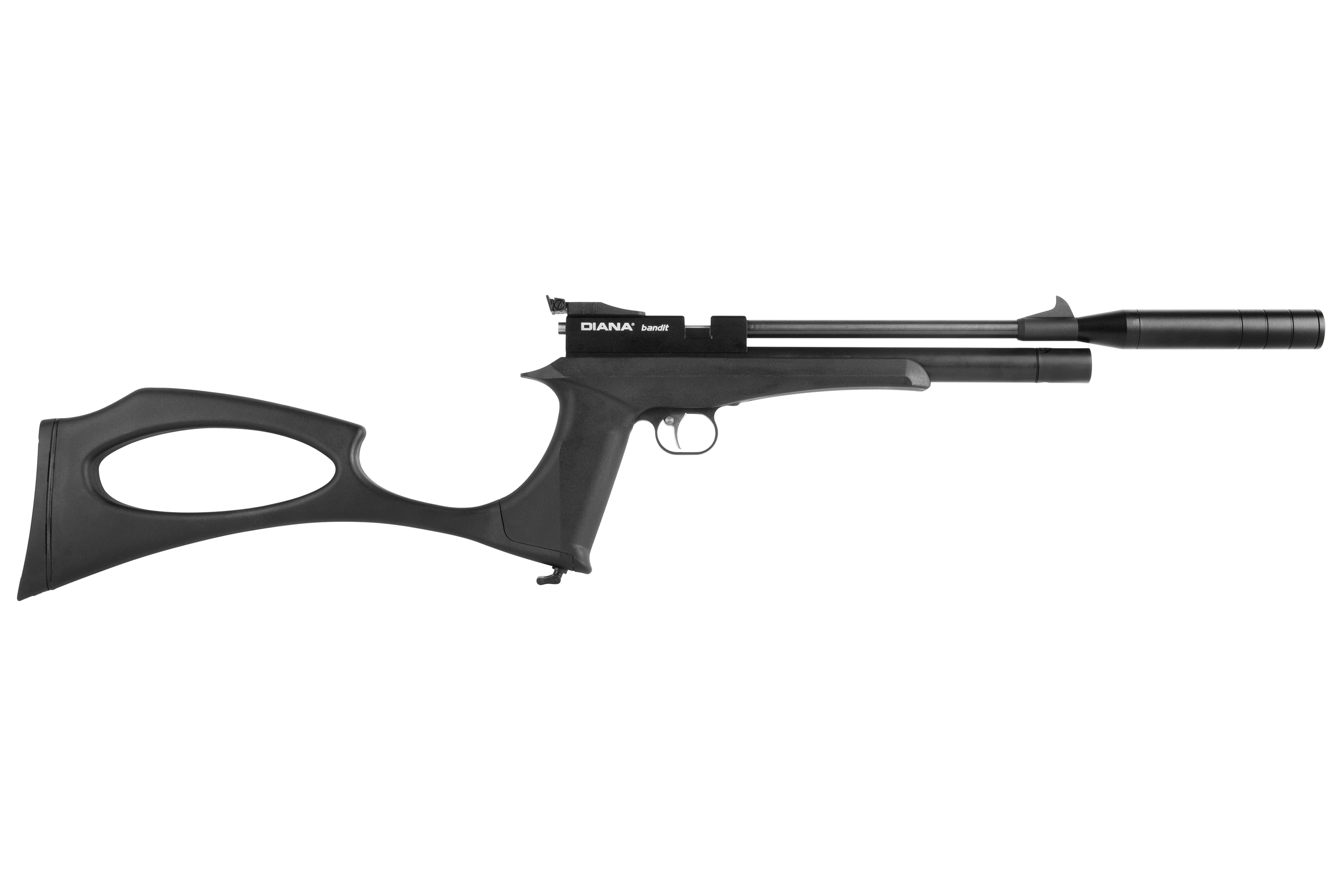 Die DIANA bandit black mit integriertem Regulator ist eine leistungsstarke Pressluft-Pistole mit abnehmbarer Schafterweiterung und aufgedrehtem Schalldämpfer. Die Pistole kann mit einer Einlage im Einzelschuss-Modus und mit einem 9-Schuss Trommelmagazin betrieben werden. Die gefräste Prismenschiene ermöglicht den Anbau einer passenden Optik. Der maximale Fülldruck beträgt 200 bar.