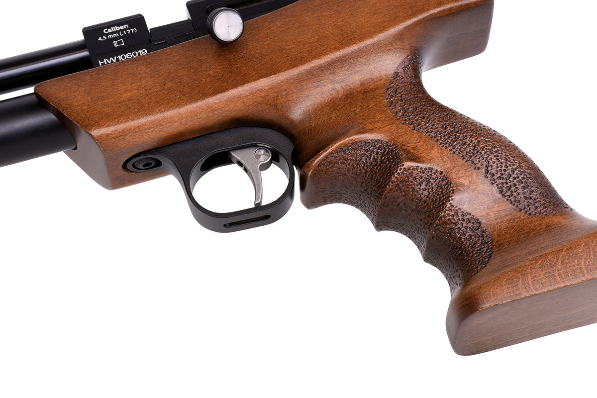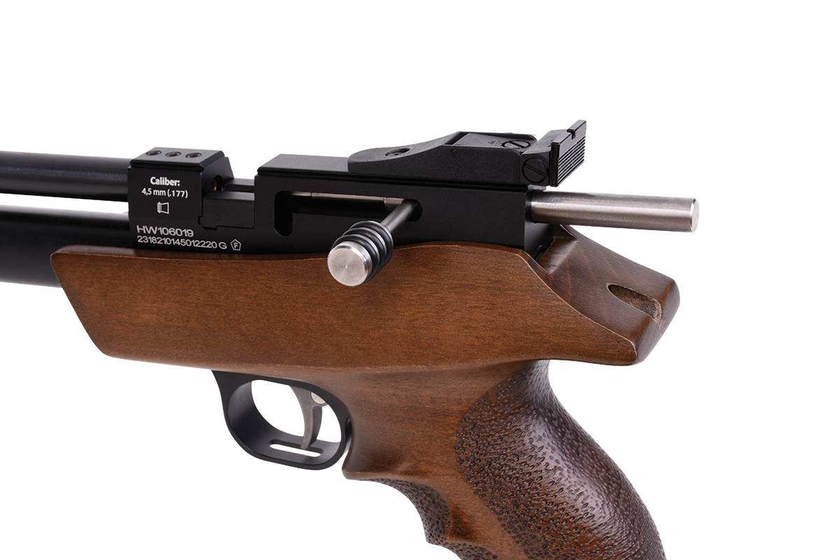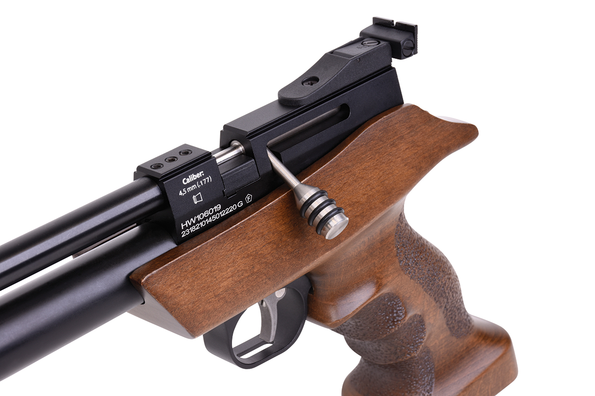 Die DIANA bandit mit integriertem Regulator ist eine leistungsstarke Pressluft-Pistole mit ergonomischen Buchenholz-Griffstück und aufgedrehtem Schalldämpfer. Die Pistole kann mit einer Einlage im Einzelschuss-Modus und mit einem 9-Schuss Trommelmagazin betrieben werden. Die gefräste Prismenschiene ermöglicht den Anbau einer passenden Optik. Der maximale Fülldruck beträgt 200 bar.