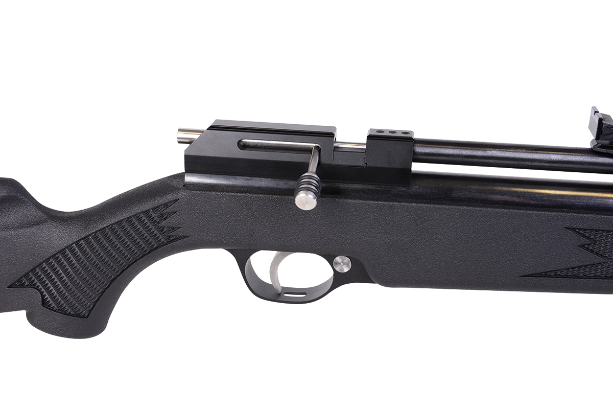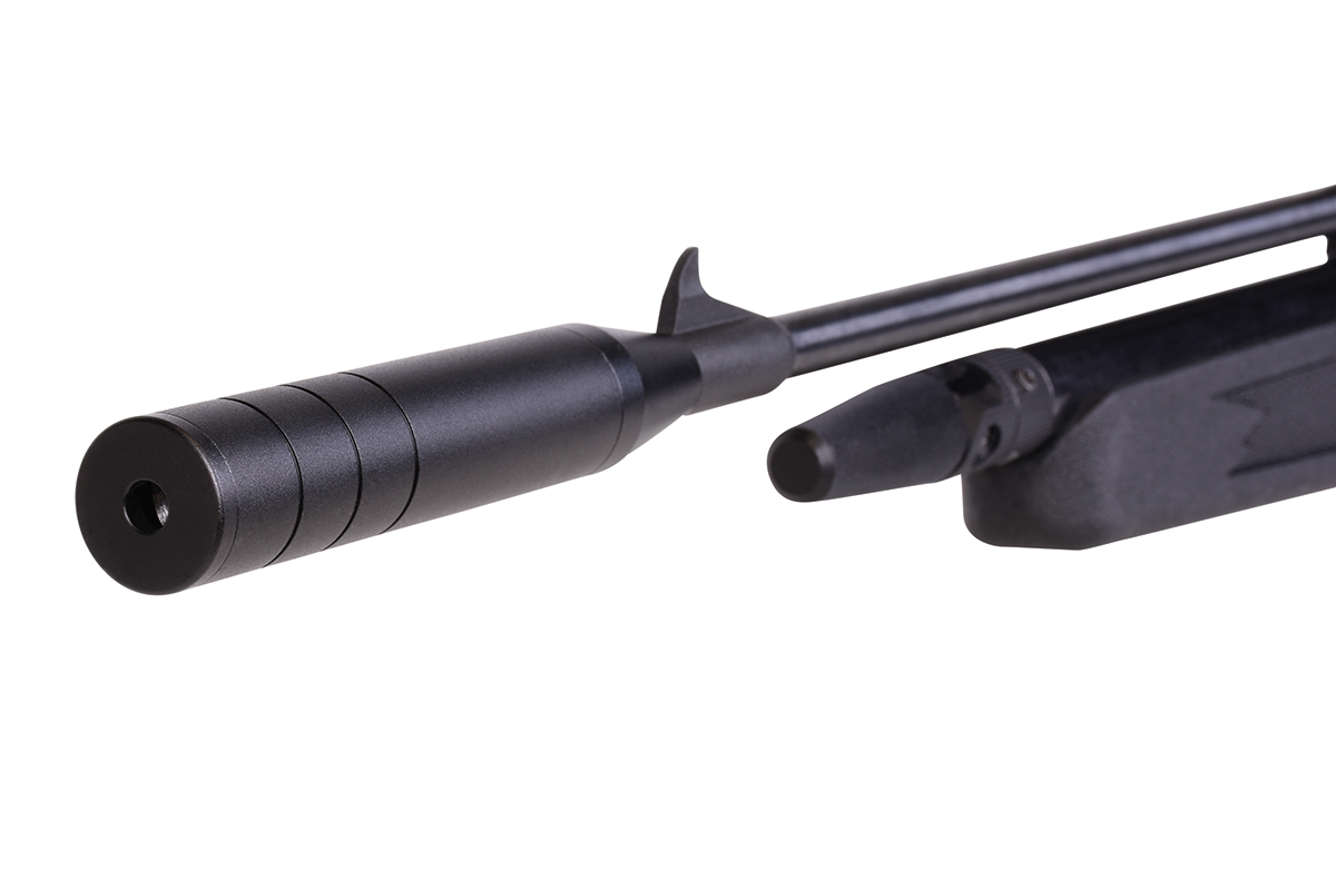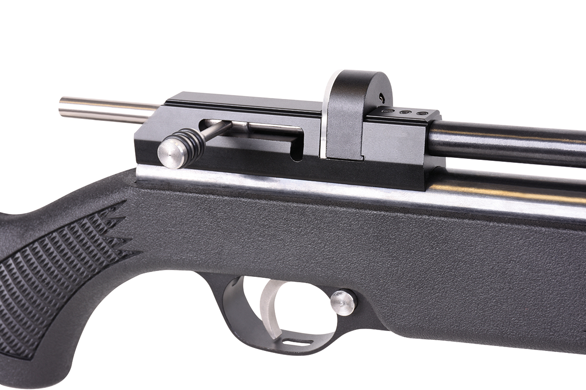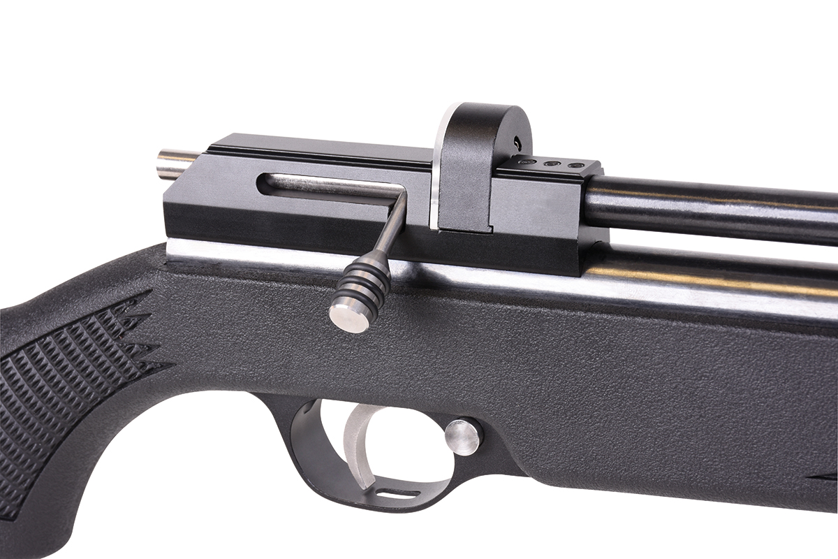 Das Gewehr kann sowohl im Einzelschuss-Modus als auch mit dem mitgelieferten 9-Schuss Magazin betrieben werden und verfügt über eine gefräste Prismenschiene, eine einstellbare hintere Visierung, einen einstellbaren Abzug und einen abnehmbaren Schalldämpfer.